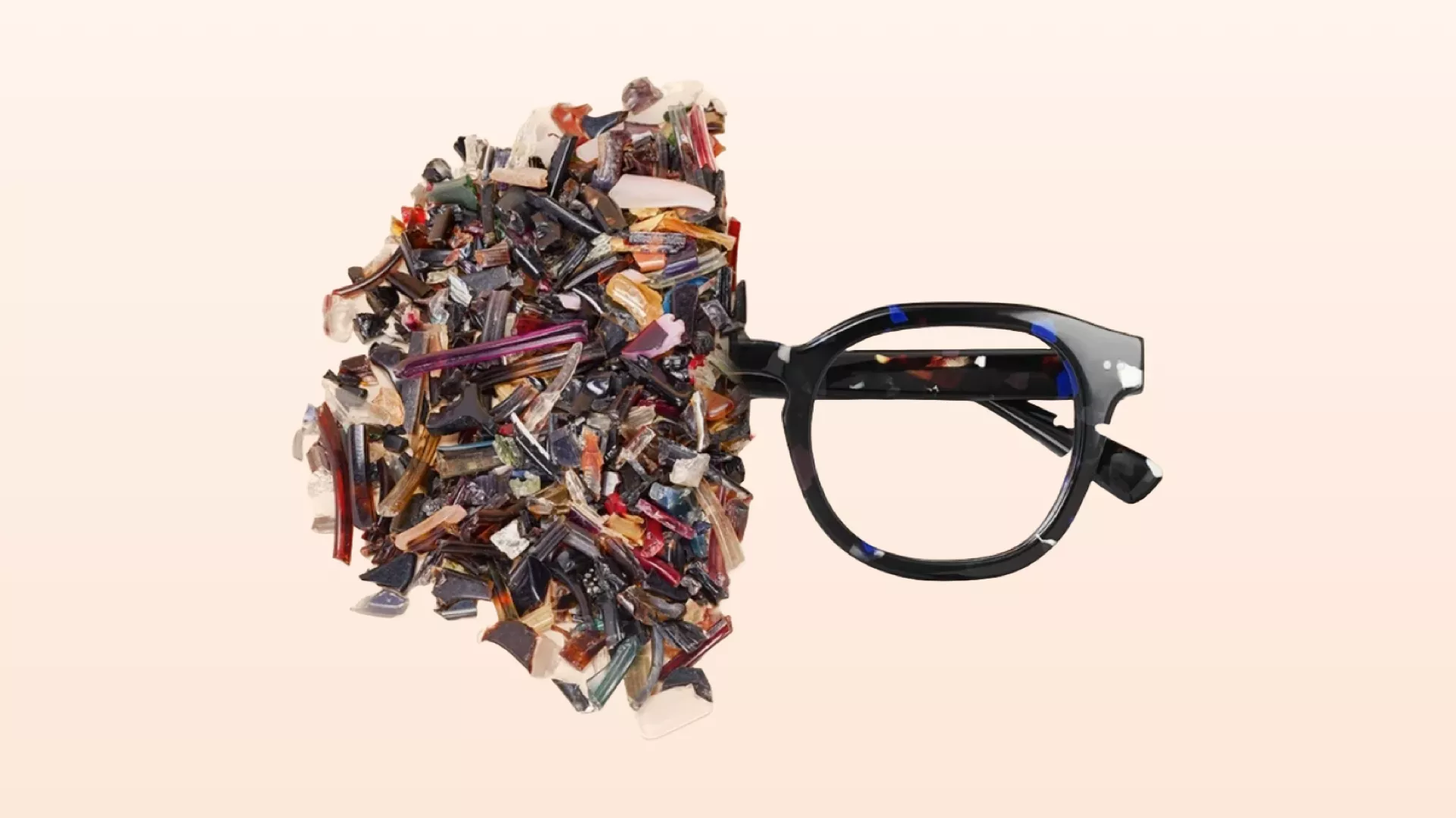 Duizenden oude brillen worden verzameld, gedemonteerd en gesorteerd op kleur en kwaliteit. De monturen worden in kleine stukjes gebroken en de metalen delen worden eruit gefilterd. Ongeveer 98% van het materiaal kan worden gerecycled. Het resultaat zijn miljoenen kleine, onregelmatige stukjes acetaat. Dit wordt de nieuwe grondstof.