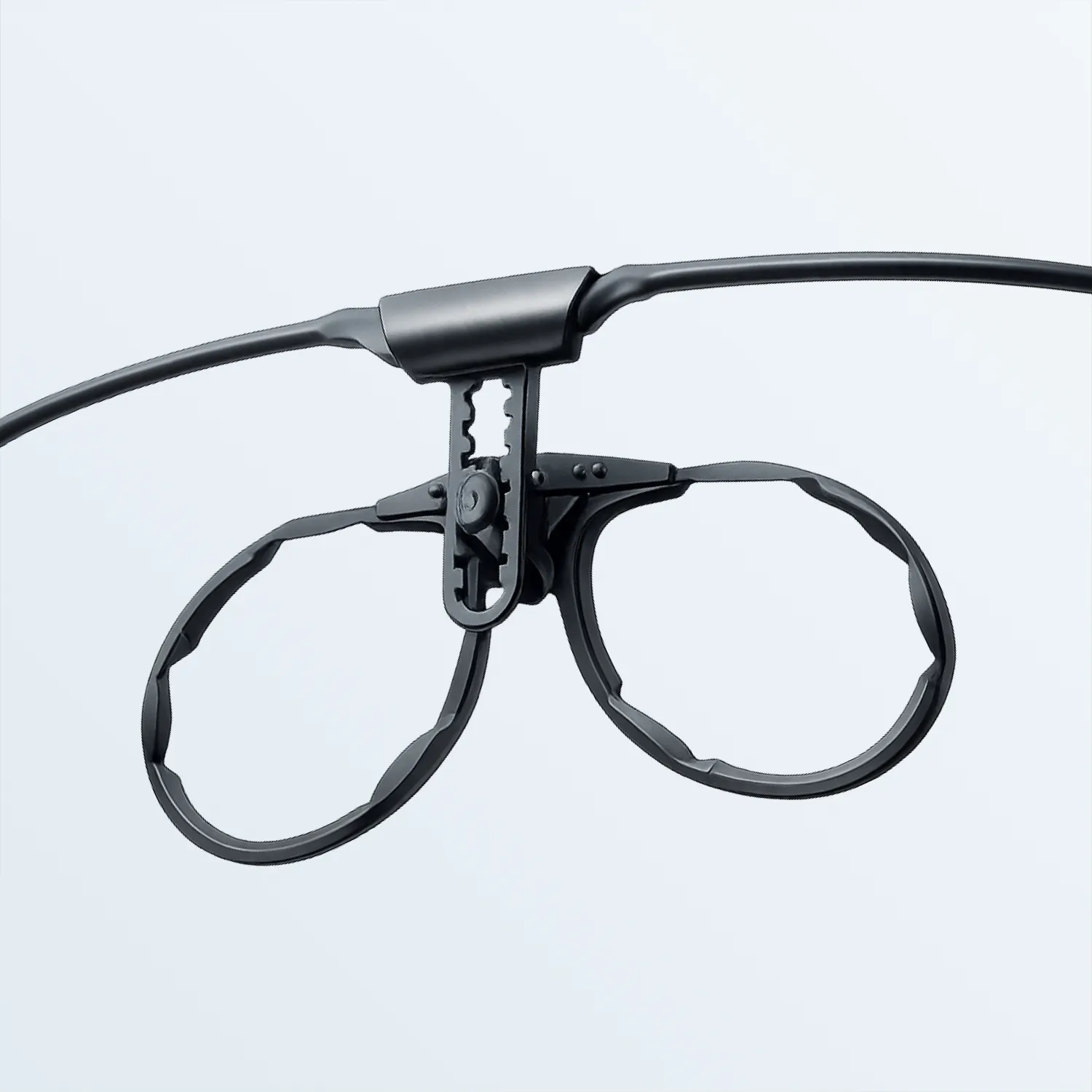 Een maskerbril op sterkte is een inlegmontuur zonder pootjes, specifiek ontworpen voor gebruik achter een volgelaatsmasker. Het montuur bevestigt aan de binnenkant van het masker op daarvoor bestemde aansluitpunten. De afdichting van het masker blijft volledig intact. Er is geen contact tussen de bril en de afdichtingszone.