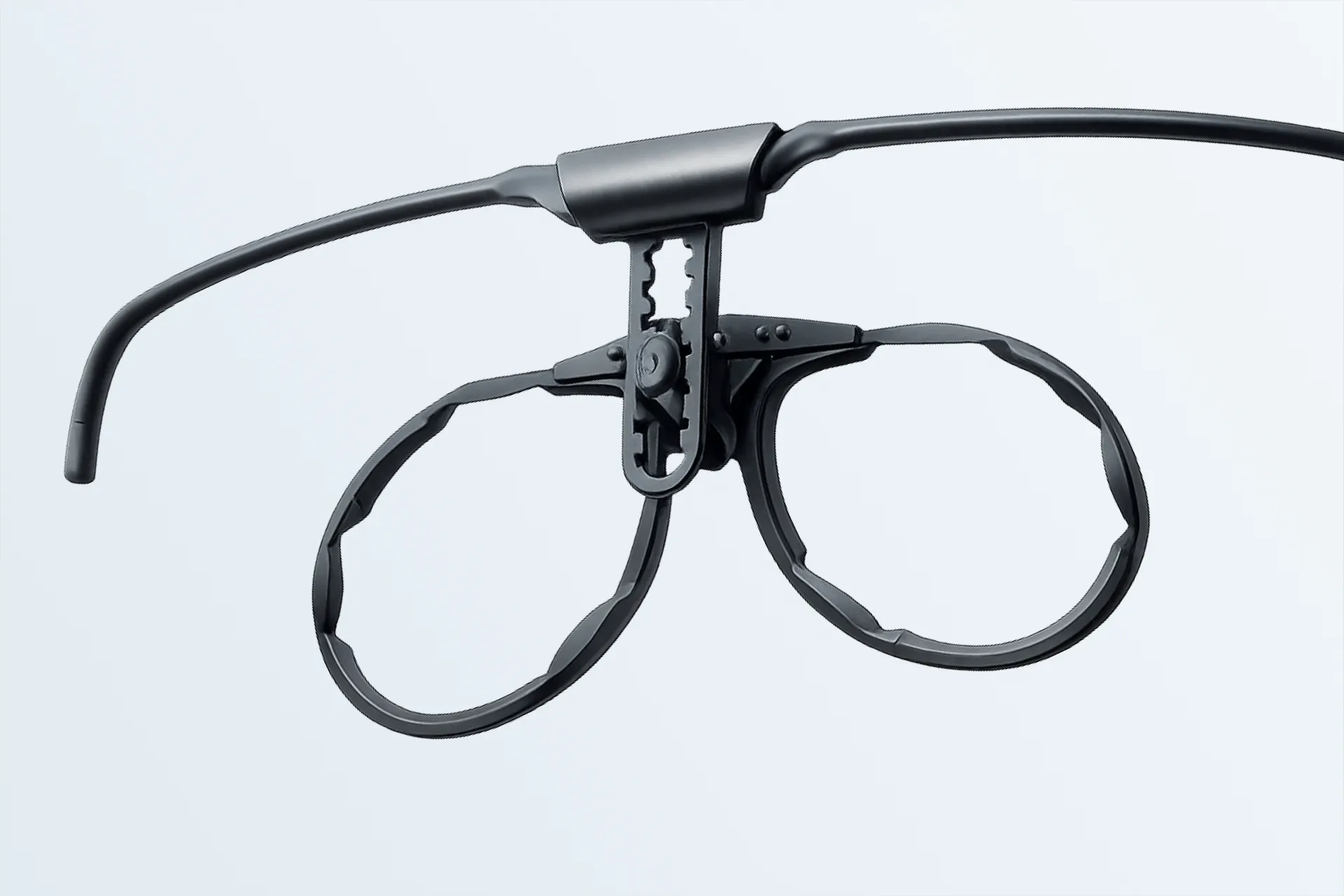 De zijkappen zijn geïntegreerd in het frame. Dat maakt het montuur visueel rustiger en technisch sterker.